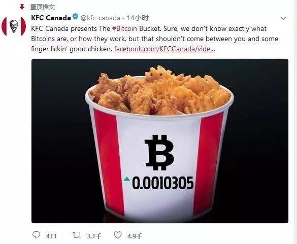 最近,加拿大肯德基发布新消息称,他们支持消费者使用比特币来购买一种专门推出的「比特币炸鸡桶」。这个新款的炸鸡桶需要 0.0010305 个比特币,根据比特币的价格计算,它的售价约为 20 加元(约合人民币 103 元)。当然,由于比特币在一直波动,所以你购买炸鸡的实际价格是不稳定的。而且,由于这是一个限时的线上活动,所以消费者只能在特定时间购买,然后由外卖送到家。