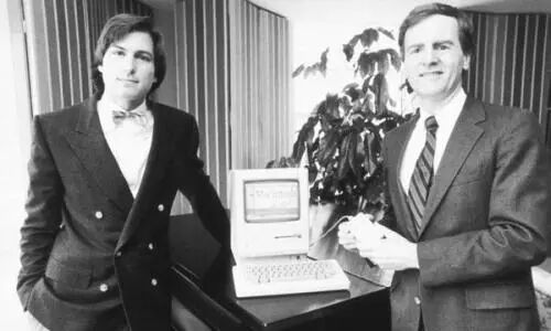 乔布斯和约翰·斯库利,照片上两人显得十分亲密,并肩微笑。@视觉中国