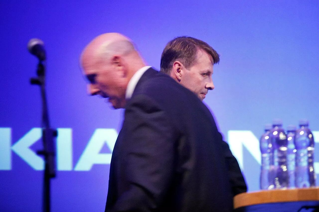 鲍尔默黯然离场后,诺基亚很快成为微软弃子。(左鲍尔默,右为诺基亚临时CEO席拉斯玛)@视觉中国