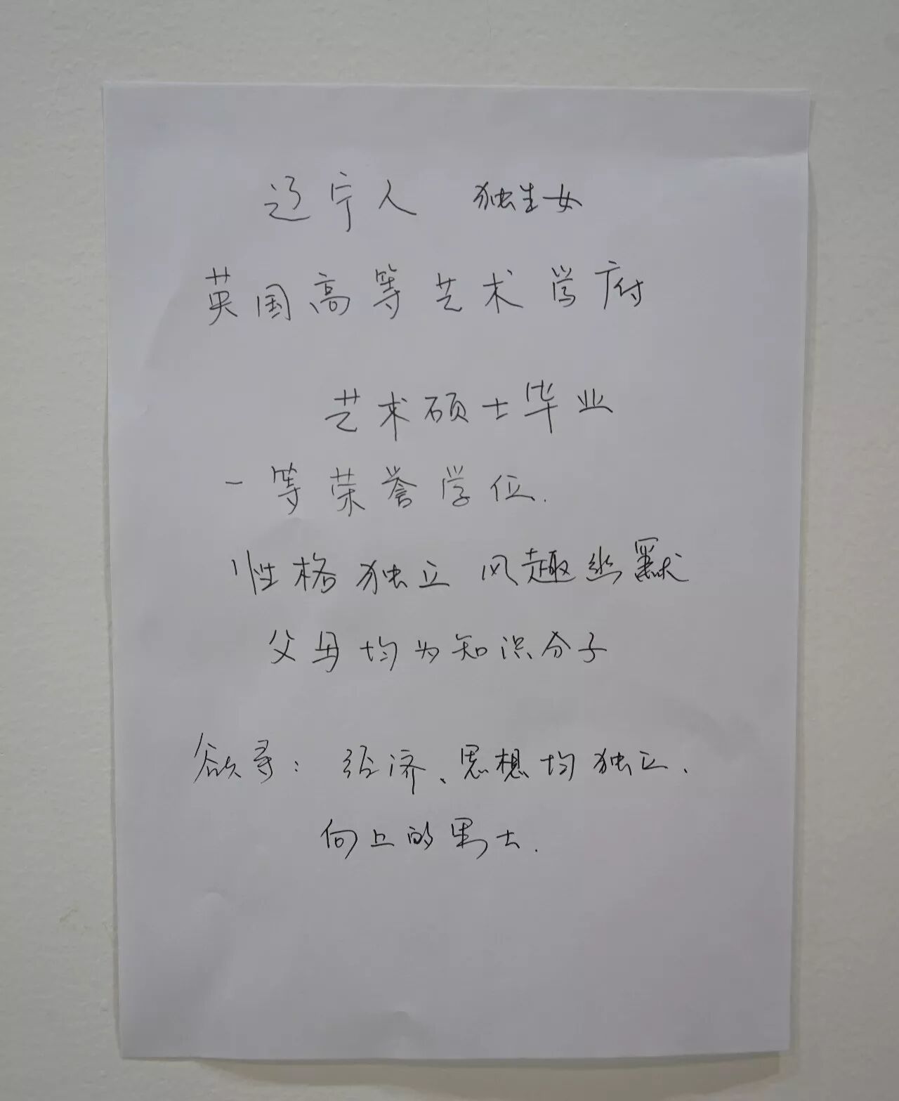 除了安排婚姻,我还想进一步探讨所谓年龄的问题,我决定做一个行为艺术,自己写了份相亲广告,随身带了个摄像头,每个周末都举着那张纸去上海人民公园站着。 在自己的相亲广告上,我写了一些自认为值得骄傲的品质,比如性格独立,风趣幽默,英国高等艺术学府艺术硕士毕业,一等荣誉学位,父母都是知识分子等等。我故意没写年龄,因为我想看看他们衡量一个女性的标准是不是只有年龄。