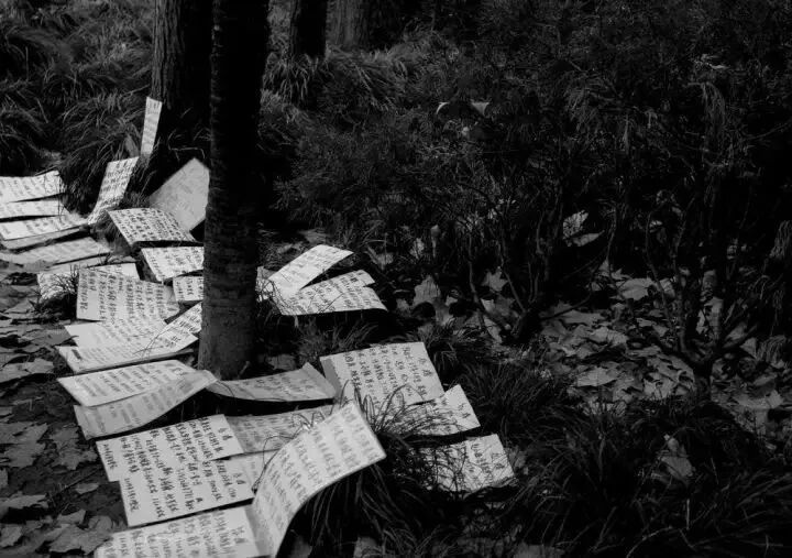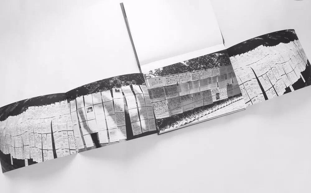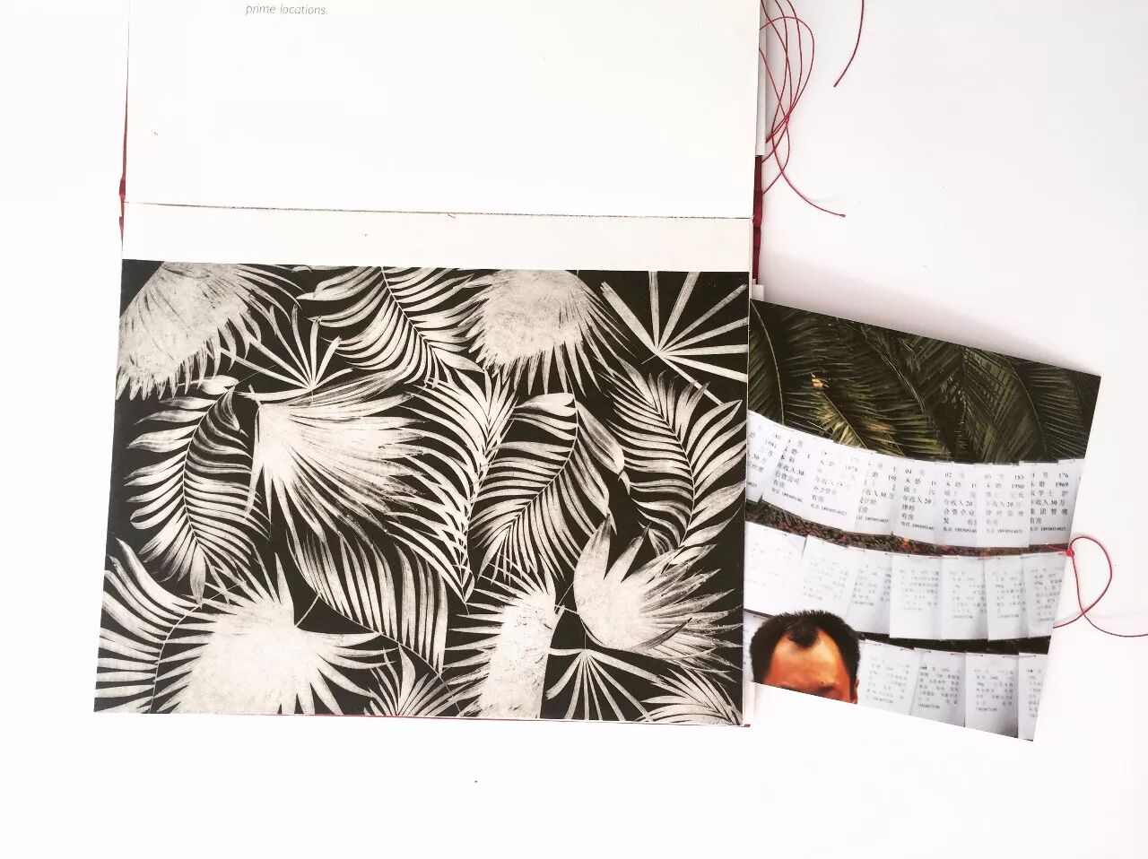有一个细节特别触动我。我看见一个妈妈用夹子夹自己孩子的个人介绍,来来回回地夹,这个反复的动作在我看来是很疼的,我觉得那不是一张纸,而是一个活生生的人,你把它拎出来,晾在那里,被挑选。 所以后来在展示这些照片的时候,我特意用了一些红绳、夹子,我想让看到这些照片的人能够感受到那种被拉扯、疼痛的感觉。在我自己做的手工书里,我还把相亲主题的照片藏在了人民公园的抽象风景照背后。抽出风景照背后的红绳,你就可以看到藏在夹页中的相亲的照片——这是一种恬静的感觉和残酷现实的对比。