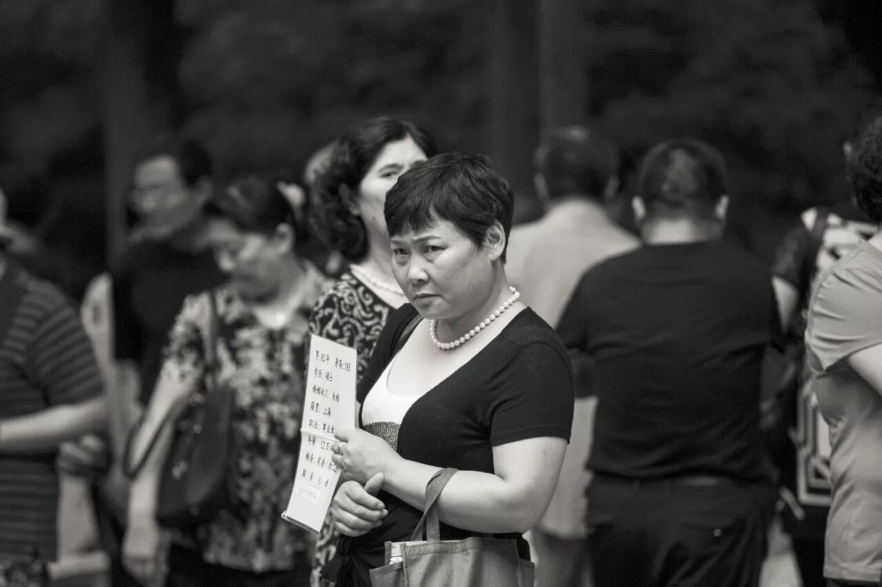 2016年夏天,我第一次去上海人民公园相亲角,当时觉得挺震撼的。 公园里放眼望去到处都是人,一撮一撮的,路的两边摆满了雨伞,伞上边挂着相亲广告,大家挤在中间逛,相中了就问,满意就交换联系方式。我当时感觉,这里不是一个公园,而是婚姻人才市场。 在那里,每一个生活中活生生的人都变成了一张纸上的一堆条件,被红绳拴着、被夹子夹着,展示在那里。来来往往的人们品头论足、估量价值,然后在心里展开一场交易。 我当时只是想拍一些照片,一开始我没觉得这些照片能成为什么,也不知道拍出来是什么样子。回家整理的时候,我把它们全都打印出来摆在地上看,结果发现照片中的那些脸,那些代替子女去相亲的父母的脸,特别是母亲们的脸上全是焦虑。这些表情都是抓拍的,但没有一张看起来很开心的脸,都很焦虑,特别焦虑。