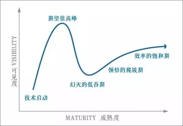 根据加德纳公司的研究,任何一项新技术,将经历从概念、胚胎发展到成熟的五个区间。它们分别是技术启动期、期望值高峰期、幻灭低谷期、领悟爬坡期和效率饱和期。