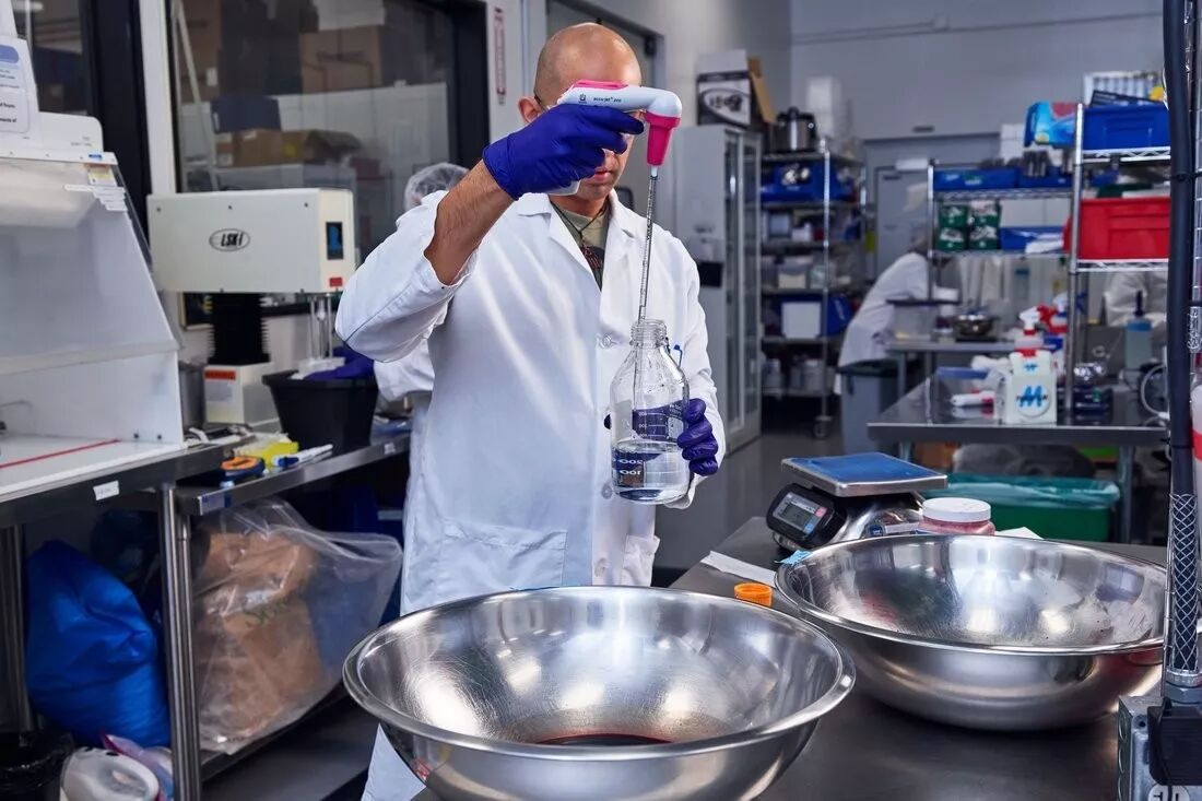 加州红木城Impossible肉饼研发办公室里,技术人员在处理原血红素。Spencer Lowell for Fortune.