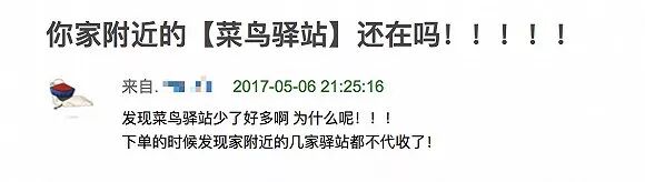 网上有一些用户发现从2017年中上旬开始菜鸟驿站少了很多,离自己最近的菜鸟驿站都在两公里外。界面新闻也发现,小区周围的菜鸟驿站点位已经不似之前密集。
