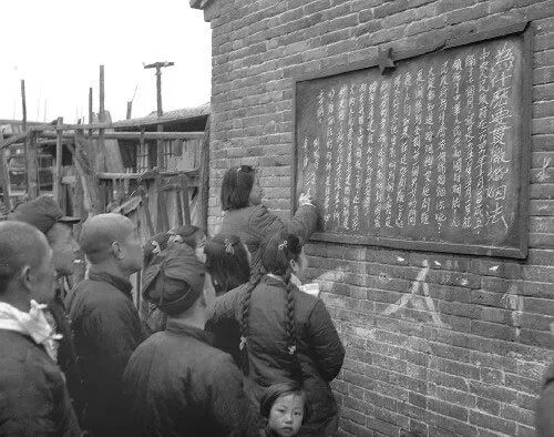 50年代初,北京市的基层干部在街头书写宣传婚姻法的板报。婚姻法规定:“废除包办强迫、男尊女卑、漠视子女利益的封建主义婚姻制度。实行男女婚姻自由、一夫一妻、男女权利平等,保护妇女和子女合法利益的新民主主义婚姻制度。”