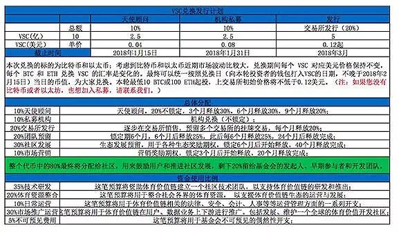 Vsport号称“用区块链改造体育产业“,计划在1月底完成机构私募,3月上境外交易所,发币总额在10亿个左右。本轮起投额度为10个比特币或100个以太币,按当前兑换比例估计,可以买125万个VSC币;如果能按计划顺利募完,以0.12美元的价格在交易所发行,单个币就能赚0.04美元,也就是说投资者至少可以赚到5万美元净利。