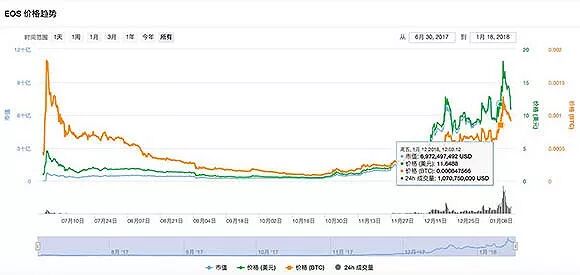他的美梦仅仅持续了几天。1月13日,EOS达到历史高点18.16美元,随后直线下跌,1月17日界面记者采访时,已跌破10美元。