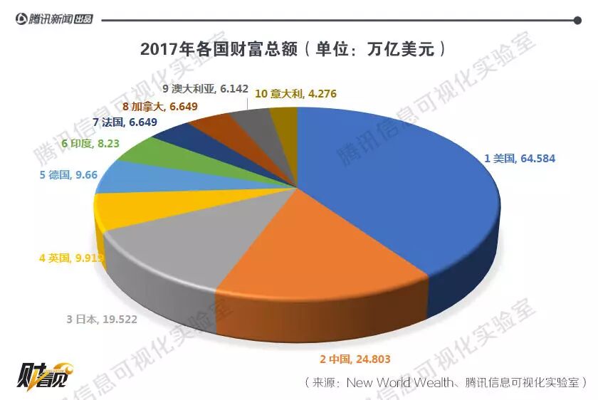 据Business Today 网站报道,财富调查公司“新世界财富”(New World Wealth)近日发布了“2017全球十大最富国家”榜单,其中,美国是这个世界上最富有的国家,2017年财富总额高达64.584万亿美元,紧随其后的是中国24.803万亿美元,日本19.522万亿美元。印度在全球最富有国家排行榜中位列第六位,财富总额为8.23万亿美元。