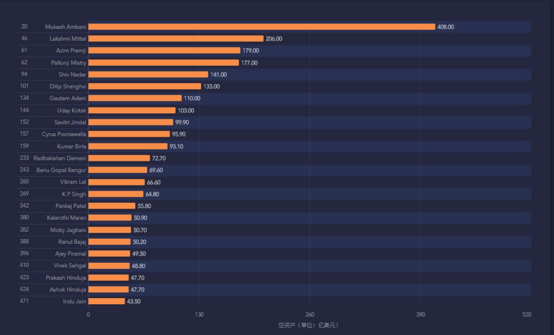 印度还拥有20730位超富,在全球超富人数排行榜中位列第七位。就常驻亿万富翁人数而言,印度位列全球第三位,为119位,排在美国和中国之后。亿万富翁,指的是那些净资产达到10亿美元或超过10亿美元的个人。