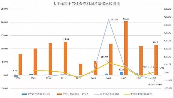 界面新闻比较了中信证券和太平洋证券的净利润及增速情况,据wind数据显示,中信证券2017年营业收入432.92亿元,同比增13.92%,净利润114.61亿元,同比增10.57%;而太平洋业绩预告显示2017年度归属于上市公司股东的净利润10000-12000万元,同比降幅达82%到85%。