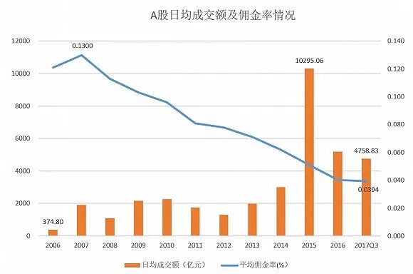 与此同时,受网上经纪业务的冲击,券商佣金比例也在不断下调,2016年年初,不少券商佣金比例已经降至万三左右。受累于投资者交易情绪低迷、佣金战火热两方面因素,整个券商经纪业务收入总量一直在收缩。