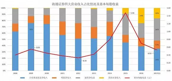 由上图可见,近10年来手续费及其佣金收入对海通证券总营收的贡献比例总体呈下降态势,并从2009年峰值时的76%,一路下跌至去年三季度时的35%,下降幅度高达54%。与此同时,以2013年为界,此前其他业务收入项目在海通证券总营收中占比甚微,2014-2016则是快速提升,分别达到了4%、9%和24%。2017年前三季度这项收入占比却下滑至16%。