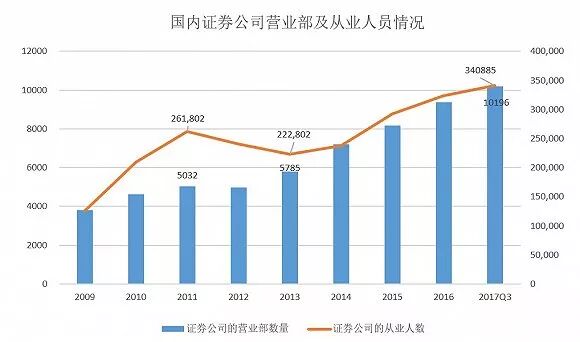 服务战的一方面体现在券商营业部和从业人员的增加。界面新闻统计发现,自2009年以来,国内证券公司营业部和从业人员总体增幅明显。“原来10个人配一个服务人员,现在5个配一个,服务自然就上去了。”邓绍辉表示。