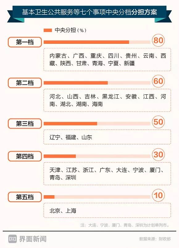 此次方案率先公布了基本公共服务领域7个事项支出责任的具体分档方法。包含中等职业教育国家助学金、中等职业教育免学费补助、普通高中教育国家助学金、普通高中教育免学杂费补助、城乡居民基本医疗保险补助、基本公共卫生服务、计划生育扶助保障等。