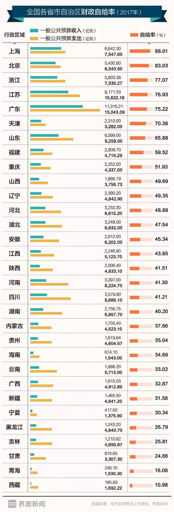 文中数据主要来自于各地两会审议的2017年地方预算执行情况报告。在最终公布的各地财政决算报告中,部分数据可能出现微调。此外,由于本文主要比较各省级行政区域的财力状况,因此没有单独计算大连、青岛、宁波、厦门和深圳等五个计划单列市的数据。