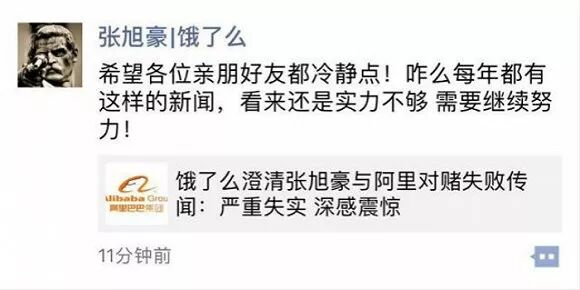 张旭豪朋友圈否认与阿里对赌失败传闻在张旭豪的字典里,“强势”、“战斗”是关键词。这个上海交大出来的85后创业者带领饿了么已经走过十年光景、经历过9轮融资、打过近百场“战役”。在竞争激烈的O2O战场厮杀,他曾经说过“创业不是为了打仗。要么不打,要打就打死。”