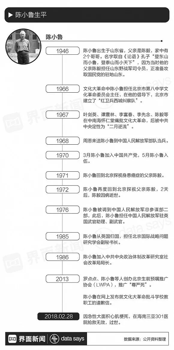 2018年3月1日上午,陈毅元帅之子陈小鲁因急性大面积心肌梗死,在海南三亚301医院抢救无效,辞世。据了解,陈小鲁昨日白天一切正常,晚间约21:20突然感觉不适呼叫妻子粟裕之女粟惠宁。随后,陈小鲁在被急救车送往海棠湾301医院的路上,停止心跳、呼吸。