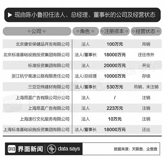 天眼查数据显示,现陈小鲁担任法人、董事长的上海标准基础设施投资集团有限公司仍持有安邦集团19.76%的股份。此外,陈小鲁担任法人、总经理的标准投资集团有限公司及安邦集团都是北京安和嘉邦房地产有限责任公司的股东。