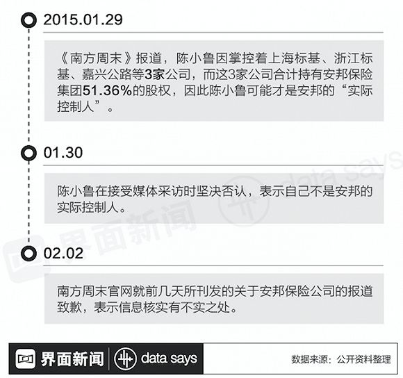 2015年,因《南方周末》的一篇报道,“陈小鲁是安邦集团实际控制人”的消息被热传。不过陈小鲁本人接受媒体采访时对此传闻坚决否认。不久后,《南方周末》官方发布声明,称自己在信息核实方面有不实之处。