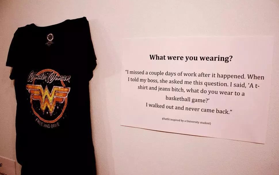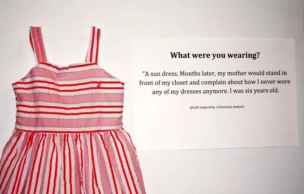 这场展览的灵感来源于2017年9月美国堪萨斯大学的类似衣物展。当时的展览上有一件红白相间的小洋装,旁边的留言写着:我还记得几个月后,妈妈站在衣柜前抱怨我为什么再不穿裙子。而这一切发生的时候,我才6岁。另一件展品是一件T恤和牛仔裤,那件事发生好几天后我才敢去上班,当我告诉老板发生了什么事情时,她却问我穿了什么。我愤怒地回答,牛仔裤和T恤啊!不然打篮球你会穿什么?接着我就冲出去了,再也没回去那儿上班。在比利时生命热线工作的戴尔芬·古森斯(Delphine Goossens)得知这些情况后联系了展览的主办方,后者在取得遭受性侵的学生同意后,在展览中再现了性侵发生时他们的衣着。