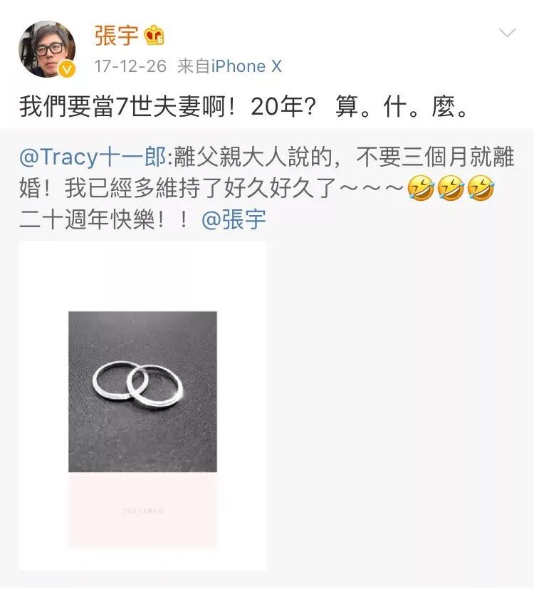 △张宇十一郎结婚20周年,发微博纪念