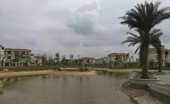 绕过两个弯,新村场的别墅区就在眼前。一排排两层半别墅,大部分已装修好,景观花草树木均已种植好,别墅区中间设计有景观湖和中心广场,小桥流水,水草丰美。