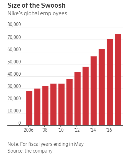 耐克员工数量持续攀升。图片来源:华尔街日报