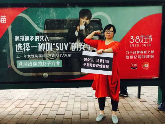 对于电商造节,有姑娘打出了“反三七过三八,我是妇女XXX”的标语