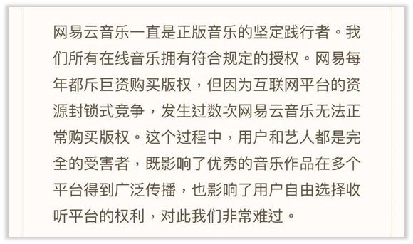 云音乐在负面公关的过程中,把锅甩到所谓的“资源封锁式竞争”上,将自身置于受害者和“为群众谋利”立场下。你瞧,很熟悉的网易式公关风格
