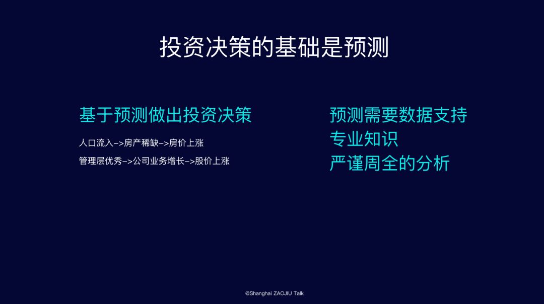投资的基础是预测。如果你预测一座城市的人口流入量会越来越多,同时这个城市的房产土地是受管控的,那么你就可以提前买入这个城市的房产,通过房价的上涨获利。