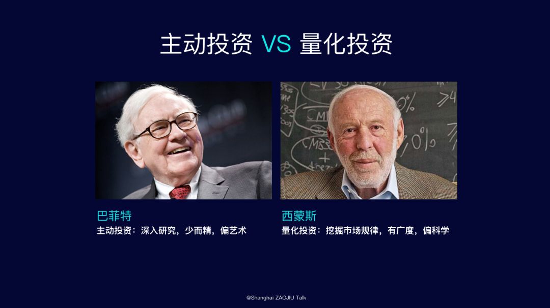 与之相对的量化投资就完全不一样。量化投资的代表人物是詹姆斯·西蒙斯,是一位数学家。他曾经管理的大奖章基金在过去三十年里创造了35%的年化回报率,超过了巴菲特。事实上这是一个费后的回报率,如果按照费前算,他的回报率应该是70%以上,远远超过了巴菲特。