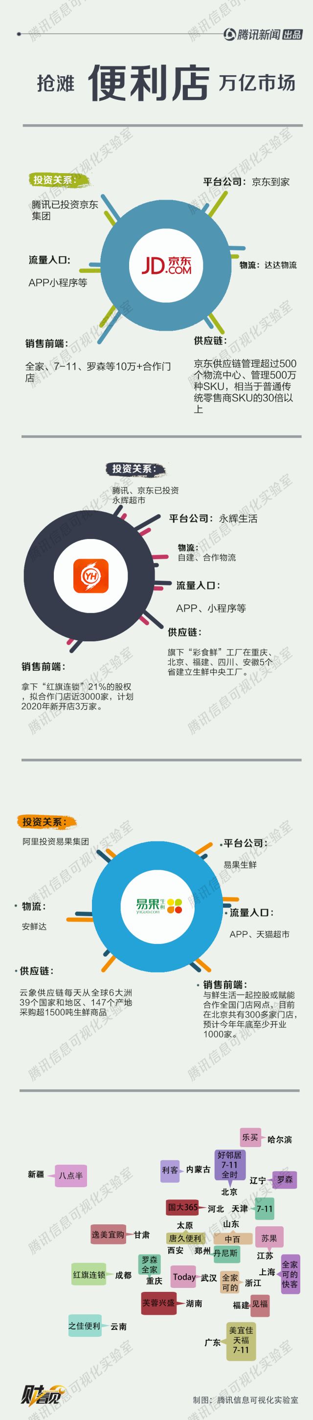 永辉已经获得腾讯42亿元的股权融资,京东到家先后获得红杉、DST、京东、沃尔玛等机构投资,累计融资额超过50亿元。充裕的资金,以及并购、合作、加盟等灵活的拓店方式,保证着巨头们的开店速度。