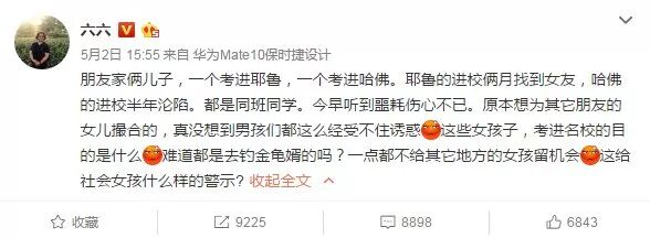 现在,连六六也站出来说了,大学男生谈恋爱是受不了勾引,女生考哈佛是为了钓金龟婿……