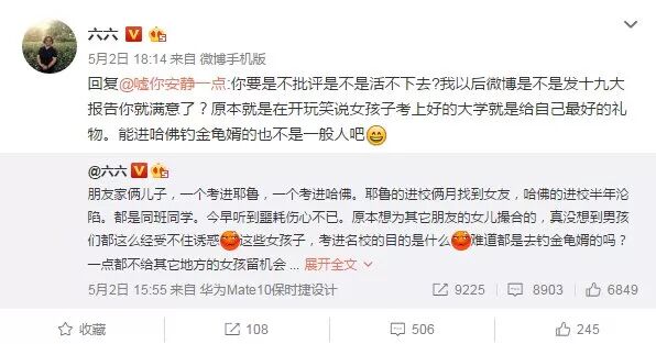 她有一千多万粉丝,这条微博很快就转发上万。有网友质疑,她也回答:“原本就是在开玩笑说女孩子考上好的大学就是给自己最好的礼物。能进哈佛钓金龟婿的也不是一般人吧。”