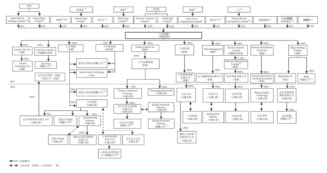 通过双重股权架构,雷军的表决权比例超过50%,为小米集团控股股东。