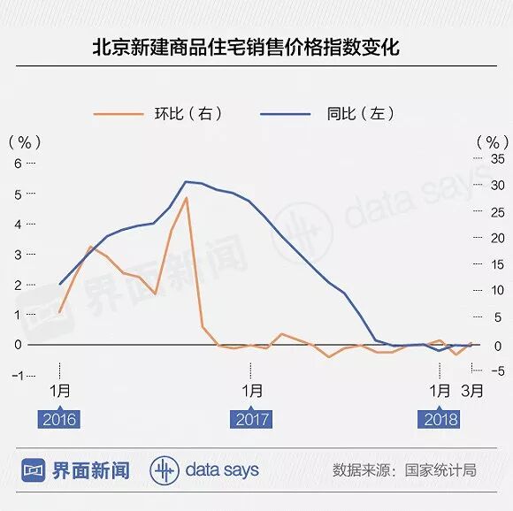 在限贷政策的助推下,北京的房价涨幅明显放缓,甚至出现下降。国家统计局数据显示,2018年3月,北京新建商品住宅销售价格指数环比增长0.1%,同比下降0.6%。