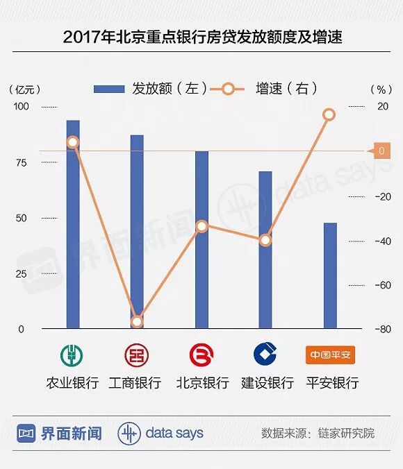 链家研究院数据显示,2017年北京市房贷发放前5名银行共发放房贷378.9亿元,较2016年下滑48.9%,其中工商银行下滑幅度最大,达到76.6%。