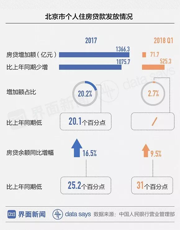 中国人民银行营业管理部数据显示,2018年第一季度,北京市个人住房贷款余额同比增长9.5%,是2014年以来首次出现个位数增长;房贷增加额占人民币各项贷款增加额的比例已降至2.7%,个人购房的杠杆率显著下降。
