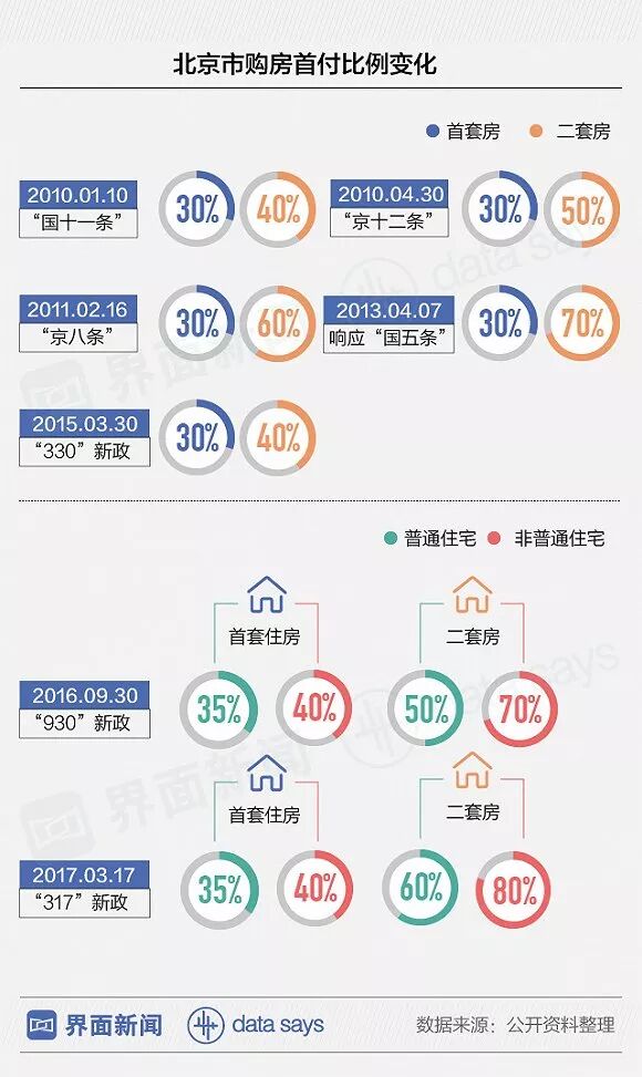 在2017年发布的史上最严调控令“3·17新政”中,北京市住建部等四部门将购买二套普通自住房的首付款比例提至60%,购买非普通自住房的首付款比例提至80%。