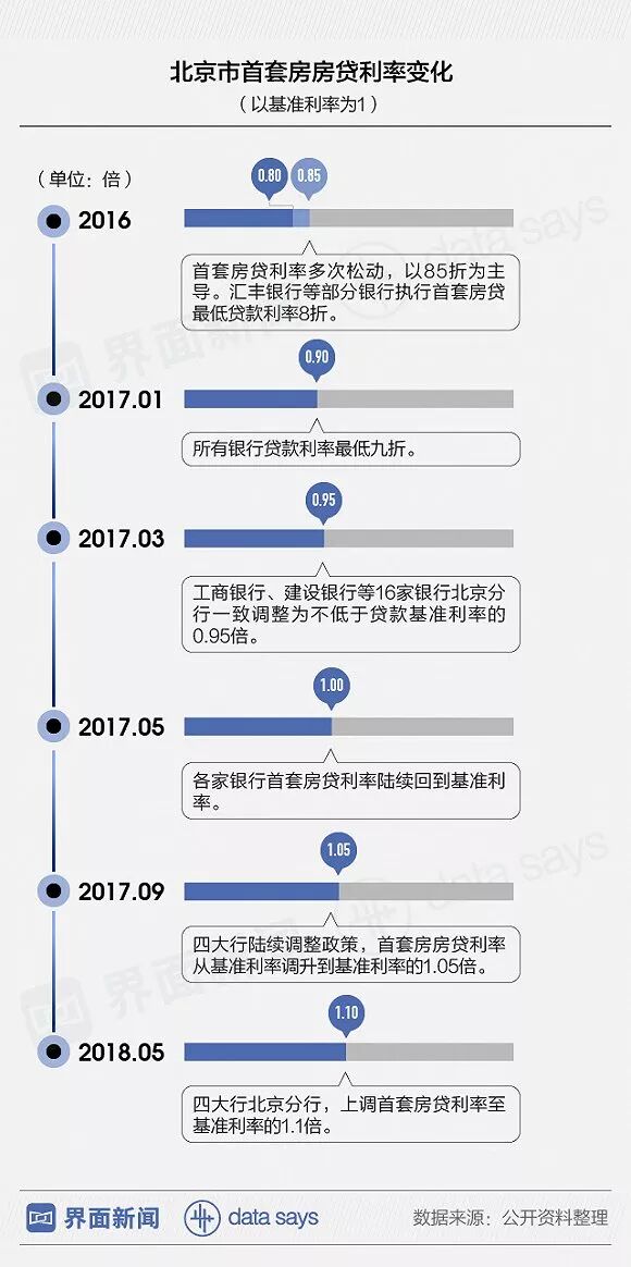 本周,“中农工建”四大行宣布将北京地区首套房房贷利率提高为基准利率的1.1倍。在经过多次上调后,北京首套房房房贷利率已经从基准利率的85折升至1.1倍。