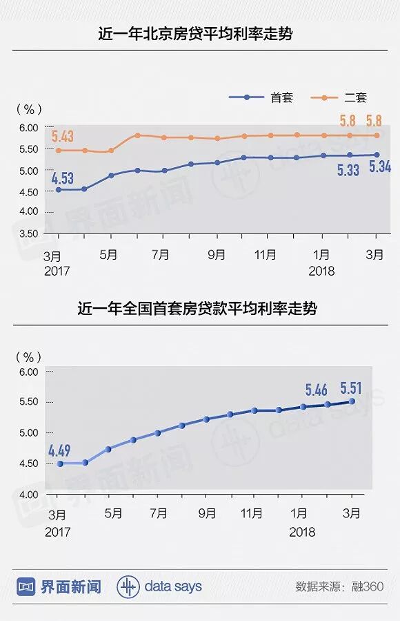 融360数据显示,截至2018年3月,全国首套房贷款平均利率已上升至5.51%,相当于基准利率1.124倍,环比上升0.92%,同比上升23.54%。全国35个城市533家银行中,98家首套房贷款平均利率上升,较上月新增45家。