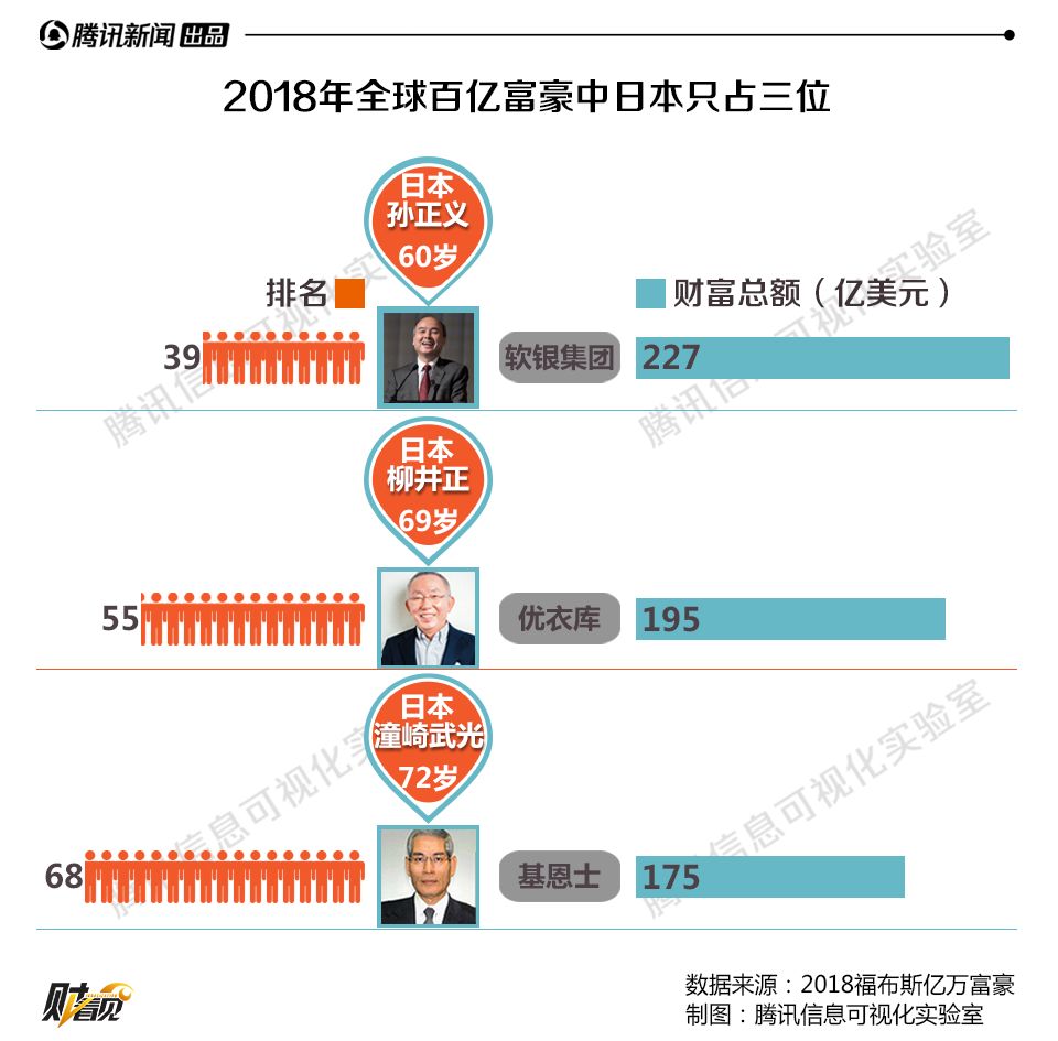 通过分析2018福布斯亿万富豪排行榜榜单可以看出,在财富超过100亿美元的超级富豪中,日本富豪只占了3位,分别为软银集团的孙正义,资产总额227亿美元;优衣库的柳井正,资产总额为195亿美元;基恩士(Keyence)的滝崎武光,资产总额为175亿美元。全球个人总资产超过300亿美元的百亿美元富豪,有26位,多集中在美国和中国,没有一位日本富豪。