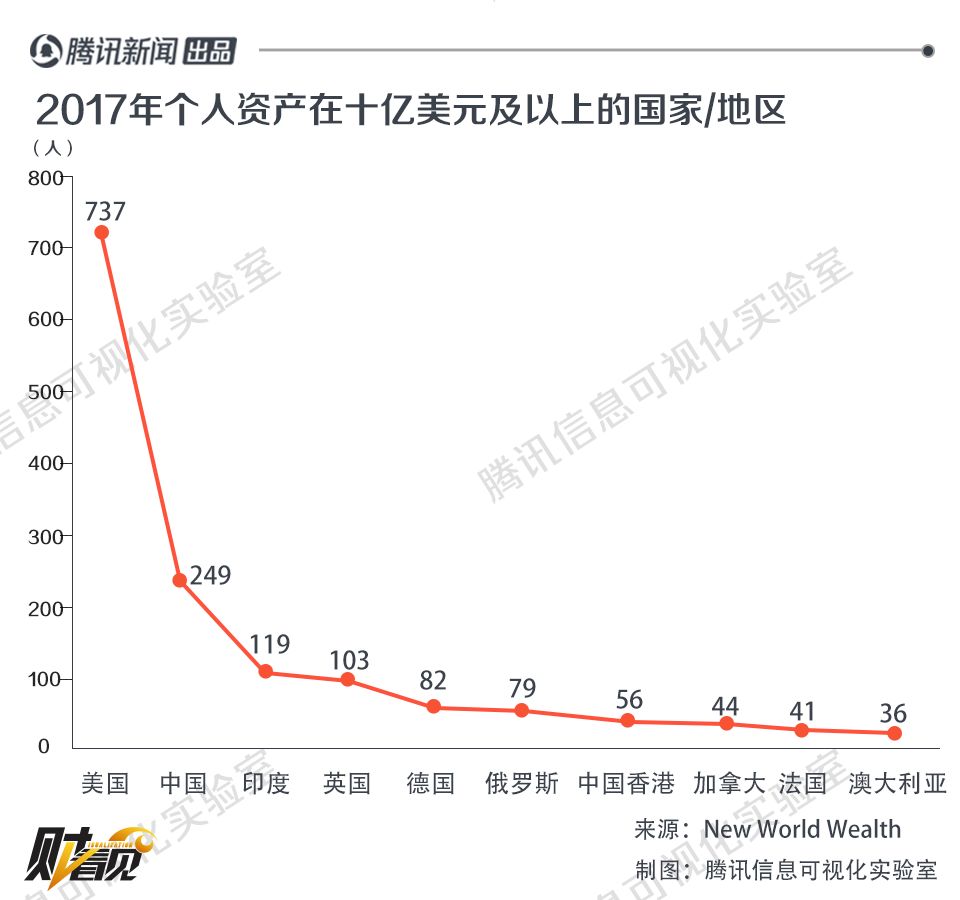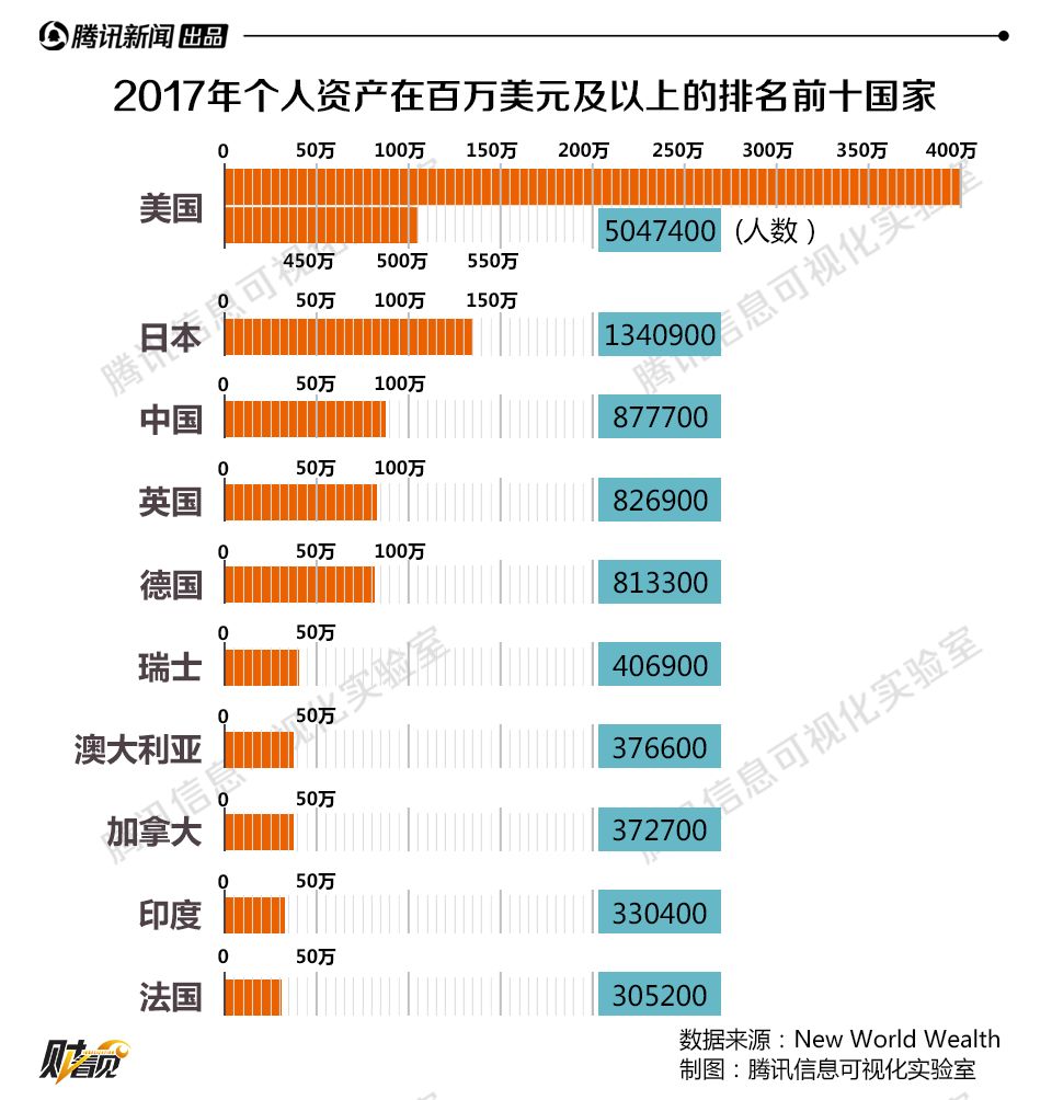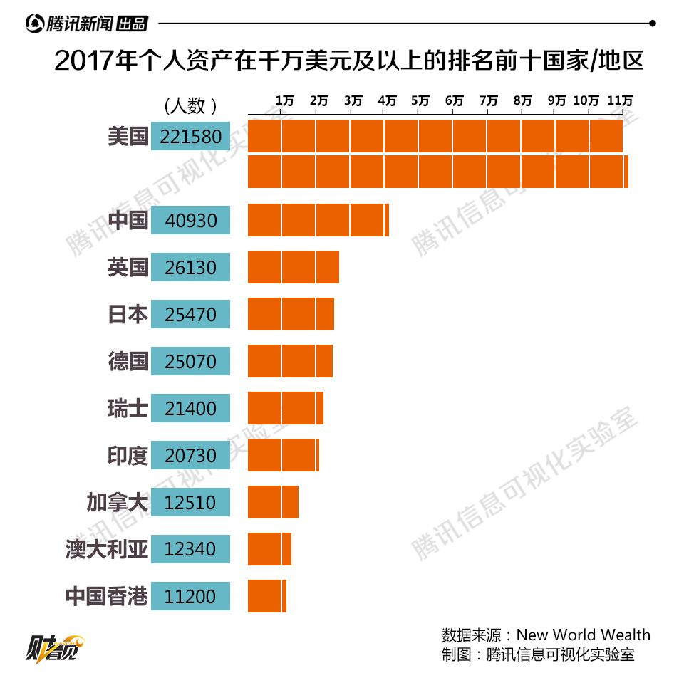 New World Wealth发布的报告《Global Wealth Migration Review》分别统计了不同国家/地区个人资产在百万美元、千万美元、十亿万美元及以上的人数。