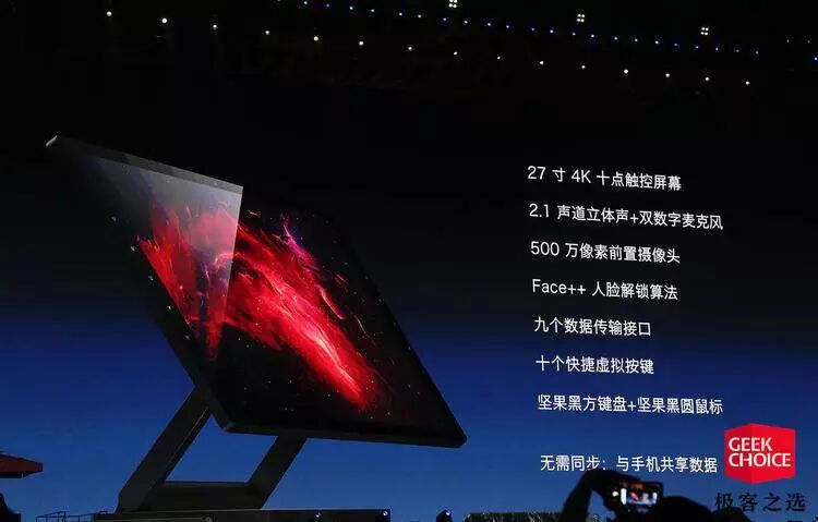 从外观看,它由一个尺寸巨大(27 吋 4K 屏)的触摸屏以及带有各种接口的底座组成。屏幕两端是让人好奇的十个指示图标,你可以看到包括闪念胶囊、大爆炸等 Smartisan OS 经典的系统功能,内置 2.1 声道立体声双数字麦克风,前置 500 万像素摄像头并支持 Face++人脸解锁。外观设计上,老罗提到它有点像 Surafce Studio,屏幕也可以用手按压下去,因此在日常办公操作时角度可以调整到非常合适的状态。