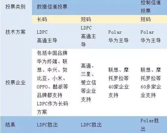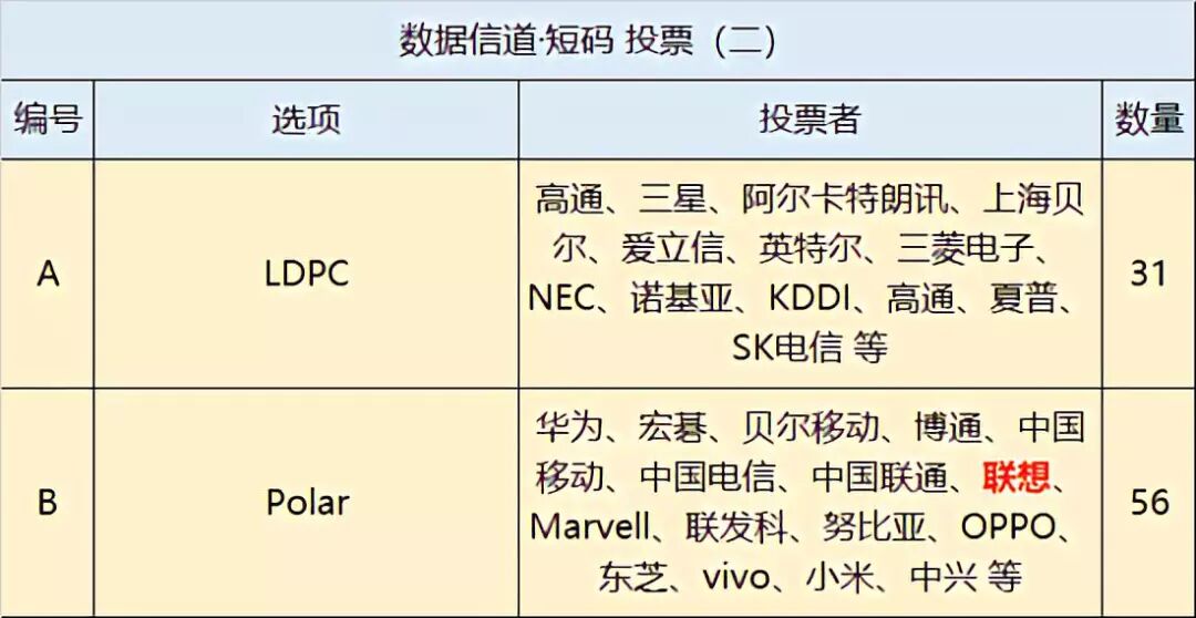 在短码提案PK中,Polar码获得 55 票,LDPC码仅获得31票,后者阵容中包括高通、三星等巨头。