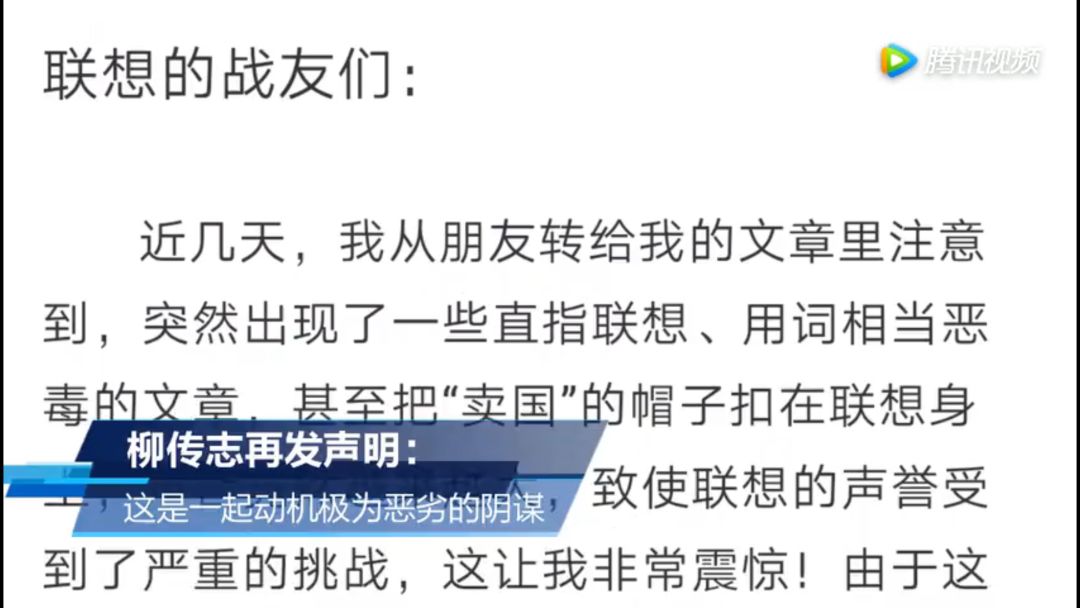 当天下午,柳传志通过一段录制音频二度发声。情绪激动处,柳传志语有哽咽。他认定“这是真正有策划有布置,动机极为恶劣的阴谋”。音频中未公布这种指向的依据。