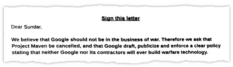 「我们认为 Google 不应该做战争的生意,」员工们在信中说道,他们要求 Google 设立一项新规定:Google 和其合约公司永远不能参与战争技术的工程。在员工们看来,Project Maven 这样的计划不仅会损害公司的名誉,还会为 Google 日后招聘人才带来不利影响。「Google 独特的历史,它『不作恶』的座右铭,还有它直接触达数以亿计用户的能力,这些都是它与众不同的原因。」