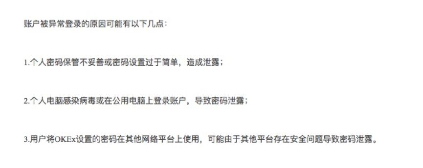 10月2日,OKEx方面发布公告,称提币未成功,不过账户被胡乱交易,造成一定损失。这份公告列出了导致账户异常登录的三个可能原因,分别是涉及“个人密码保管”、“个人电脑感染病毒”及“用户在其他平台使用OKEx密码”。