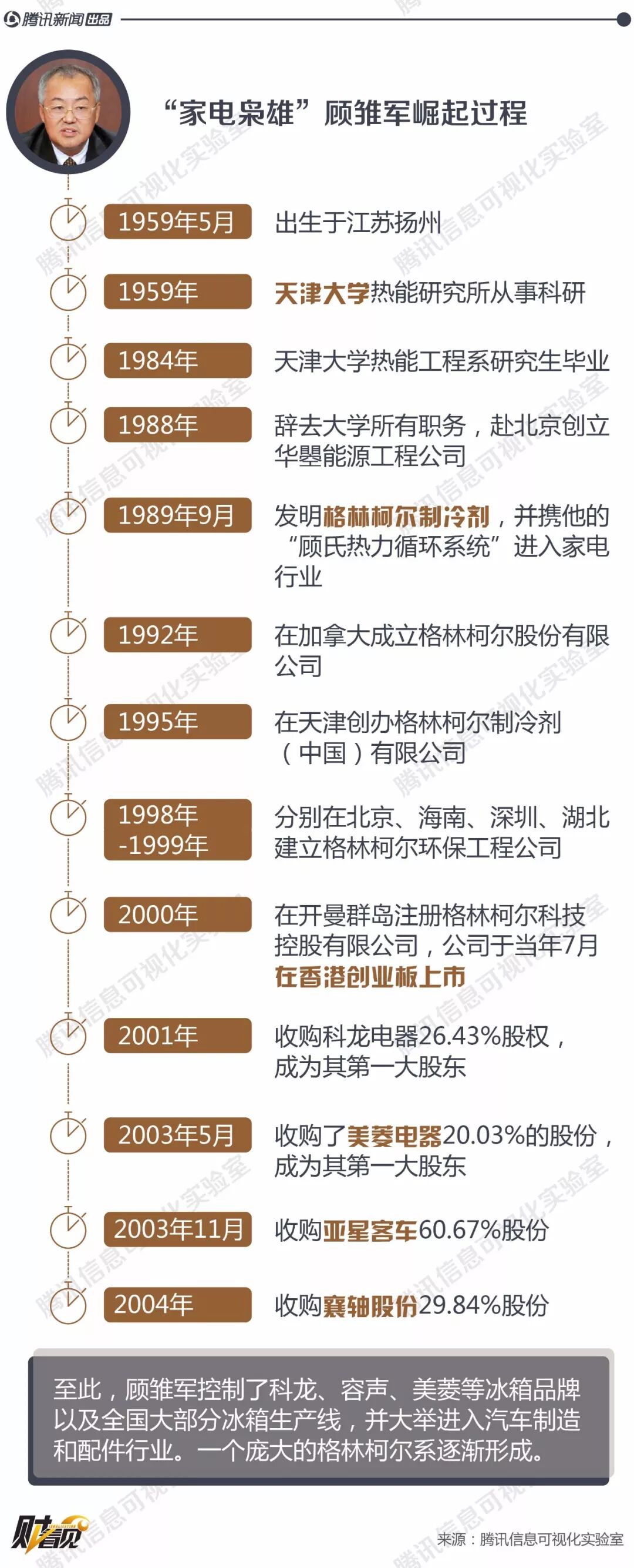 在现在的中国商界和资本市场上,大家对顾雏军并不熟悉,如果时间回溯到20年前,顾雏军绝对算的上中国家电行业的“枭雄”。顾雏军一手创立的“格林柯尔系” 控制了科龙、容声、美菱等冰箱品牌以及全国大部分冰箱生产线,通过市场并购,2013年底,顾雏军已拥有4家A股公司和1家香港创业板公司。
